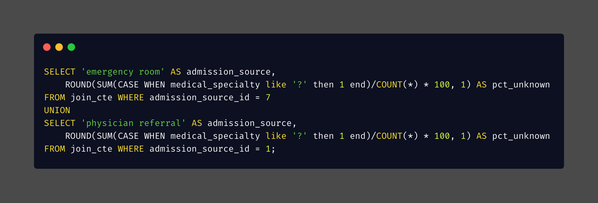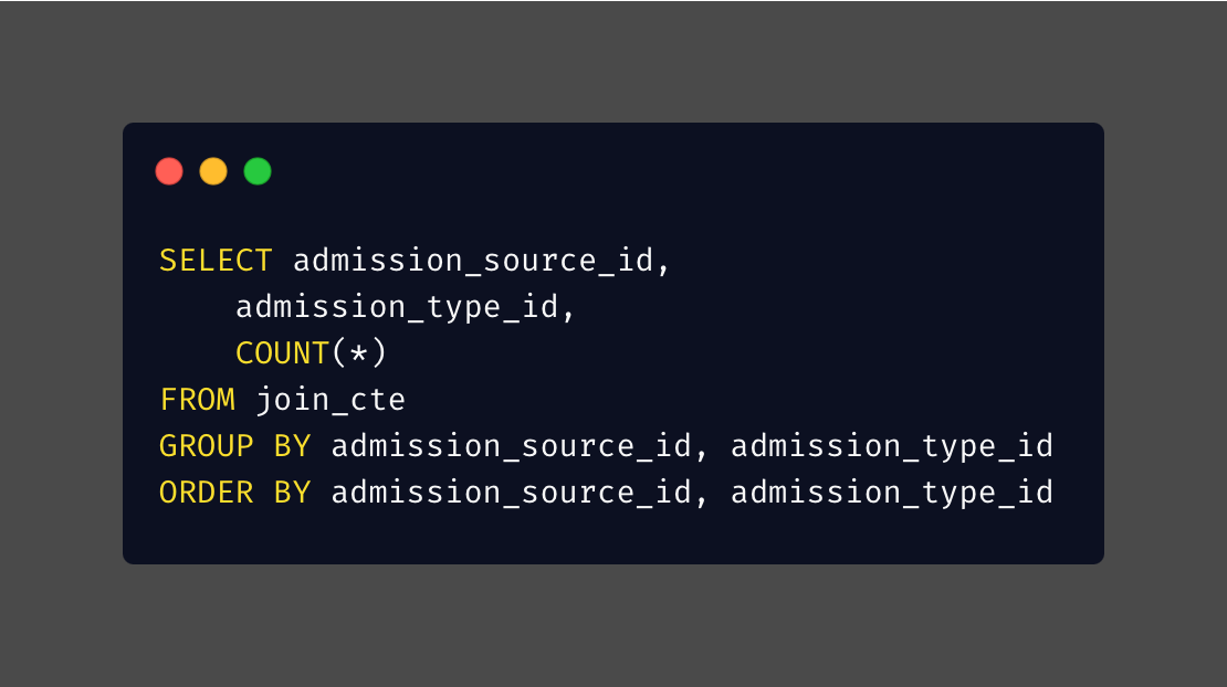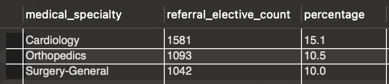 Query for the referral elective count similar to the emergency room count, but changed the admission_source_id and admission_type_id accordingly.
