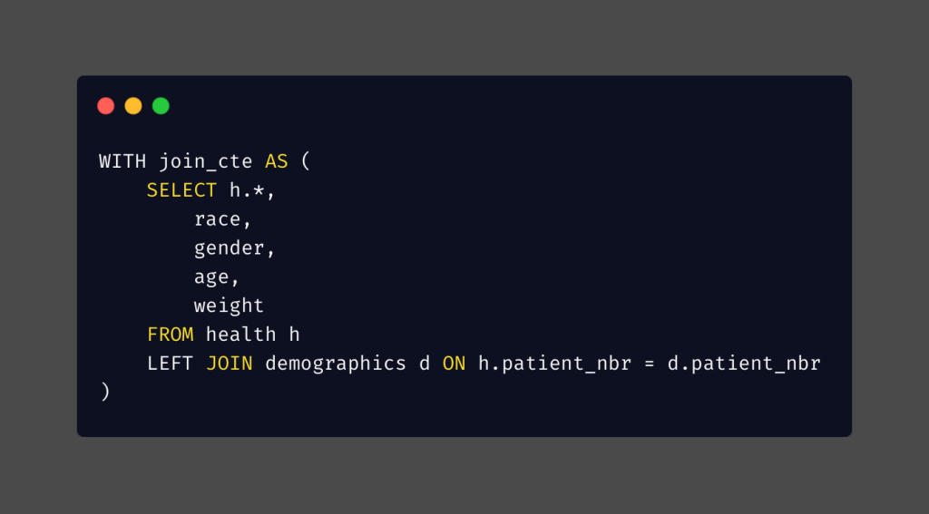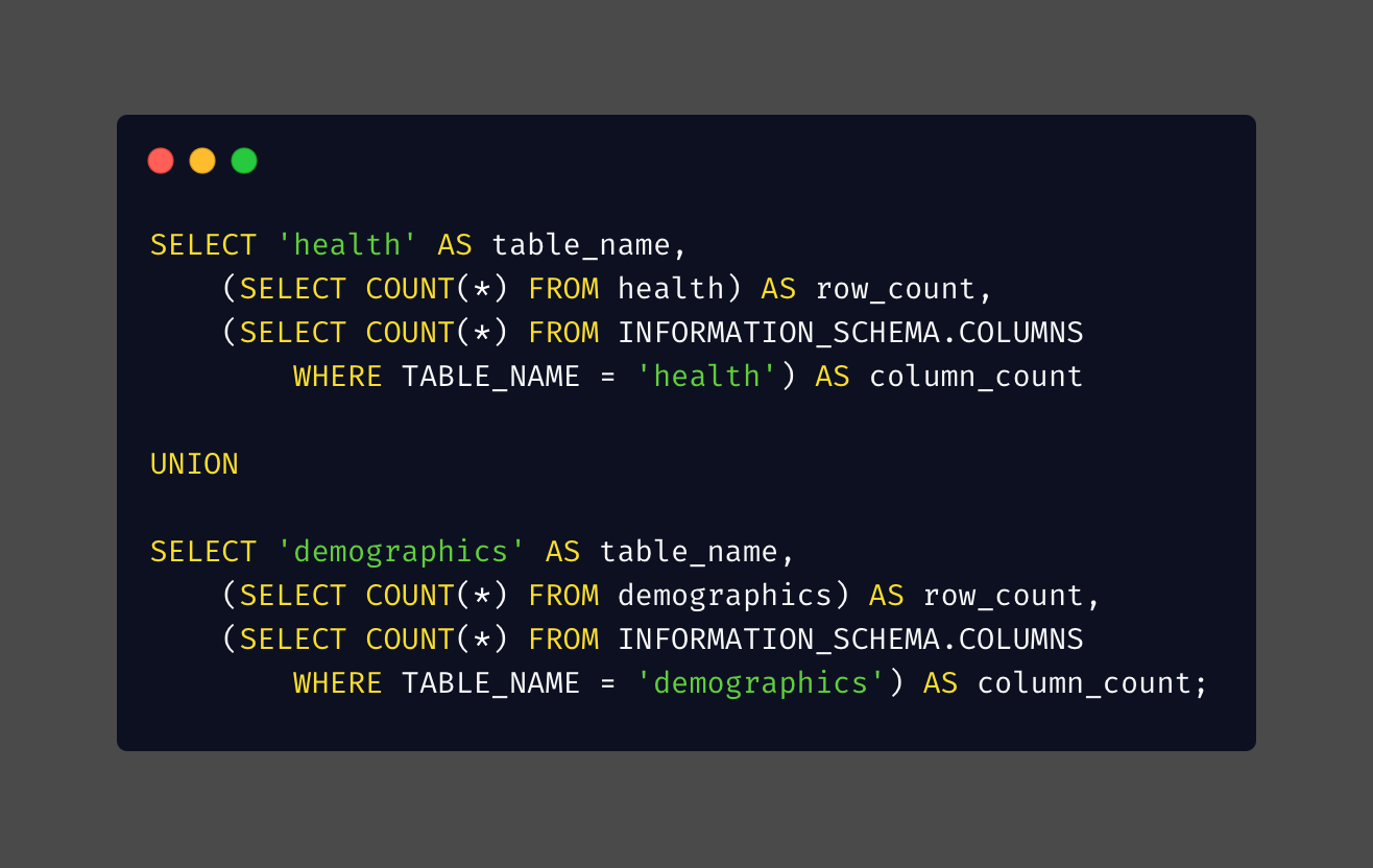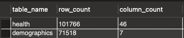 Now, I can confidently combine these 2 tables using LEFT JOIN. I included all columns in the health table but excluded 2 columns in the demographics table: rowNumber and RID.