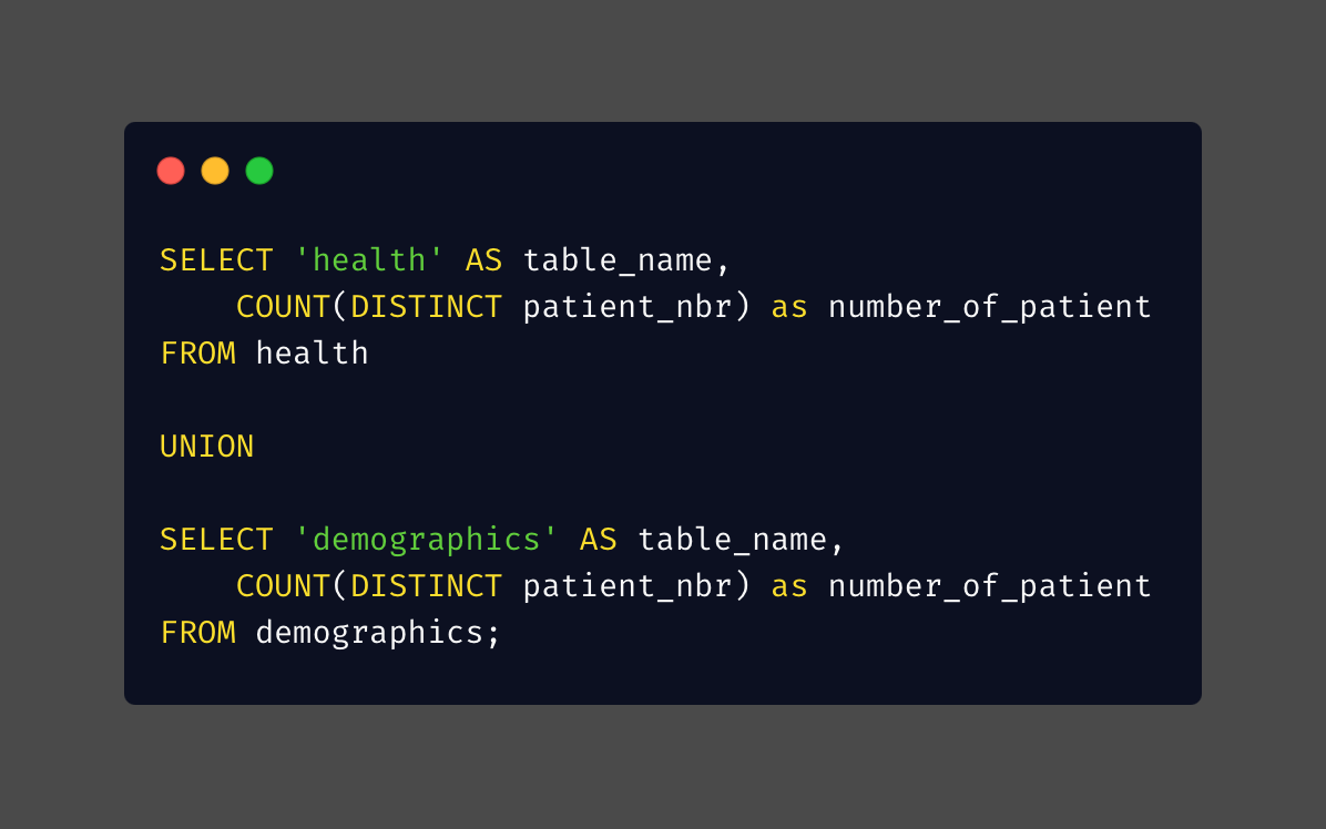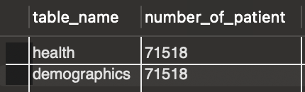 From the 2 steps above, I confirmed that I have the same number of patients in both tables, and that, based on their IDs, both tables include the same patients.