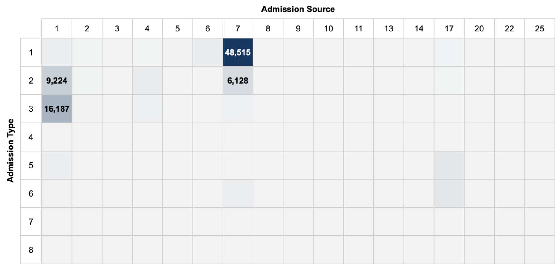 The three most common admission types were emergency (ID=1, 53% of total admissions), elective (ID=3, 19% of total admissions), and urgent (ID=2, 18% of total admissions). And the two highest sources of admission were the emergency room (ID=7, 56% of total admissions) and physician referrals (ID=1, 29% of total admissions).