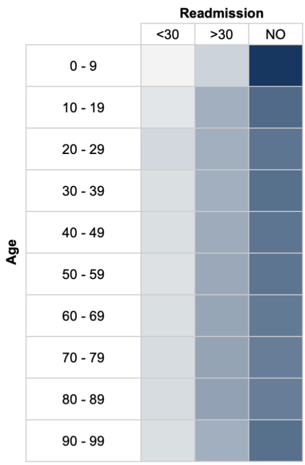 The majority of patients in each age group were not readmitted. The age group 0 – 9 had the highest rate of no readmission. Among those who were readmitted, it typically occurred after more than 30 days.