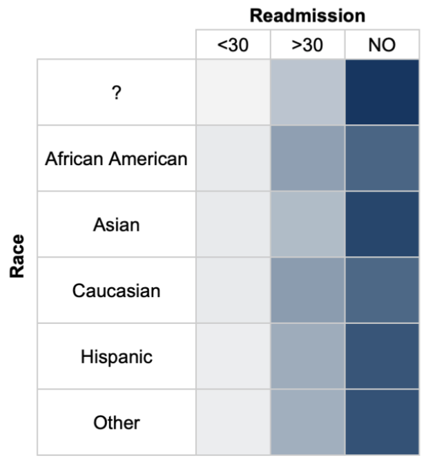 In the readmission analysis, each racial group shows a similar pattern. Most admissions do not involve readmission, and when readmission occurs, it is most likely after more than 30 days.