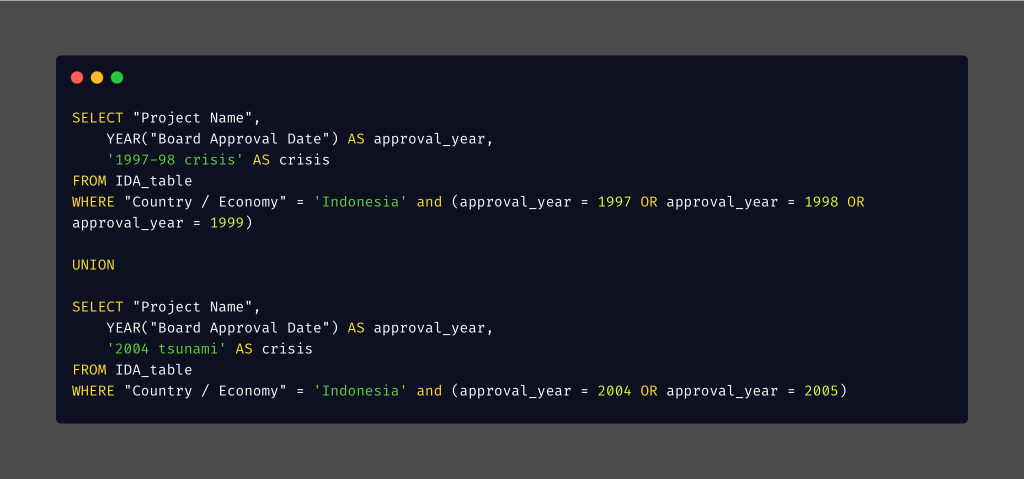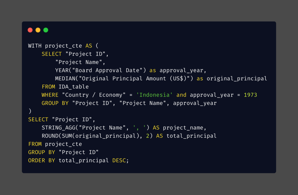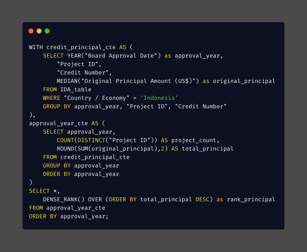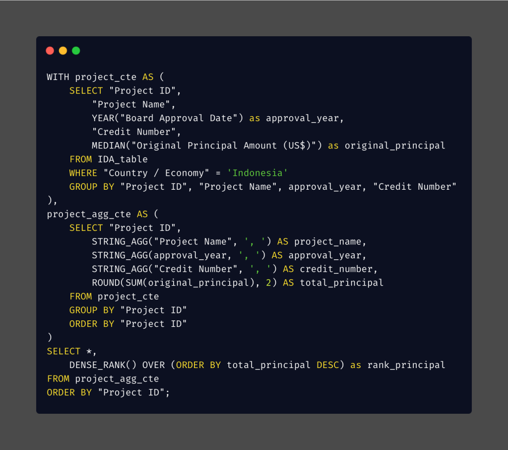 * When I grouped the data by Project ID, I observed duplicate approval years and credit numbers within a single PROJECT ID in the result table, for example P059931, P068949, and P071316. This issue occurred because some project names were truncated in the dataset. As a result, SQL processed these truncated names as separate entities during aggregation.