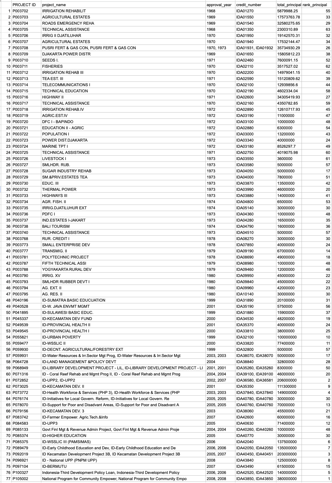 - A total of 77 projects have been recorded. Of these, three projects were approved in two different years, each time under a different credit number. For example, project P003708 was approved first in 1970 and then again in 1973. Similarly, project P072852 received approval in 2002 and again in 2007, while project P092019 was approved in both 2005 and 2007. This suggests that these projects may need additional funding to continue their efforts.