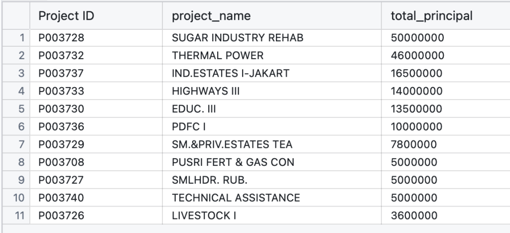 Following up on the analysis in section 1, which identified 1973 as the year with the most projects, I will now review the names of these projects. They span a variety of sectors, including agriculture, livestock, electrical power, infrastructure, and education. The largest principal amount was awarded to a project related to the sugar industry.