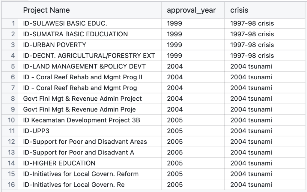 - Further research in those specific projects: the Urban Poverty project was indeed intended to help with the 1997-98 crisis, while the Coral Reef Rehabilitation and Management Program Phase II was not correlated with 2004 tsunami crisis. The World Bank helped the 2004 tsunami crisis not through IDA but was proposed through a multi-donor trust fund.