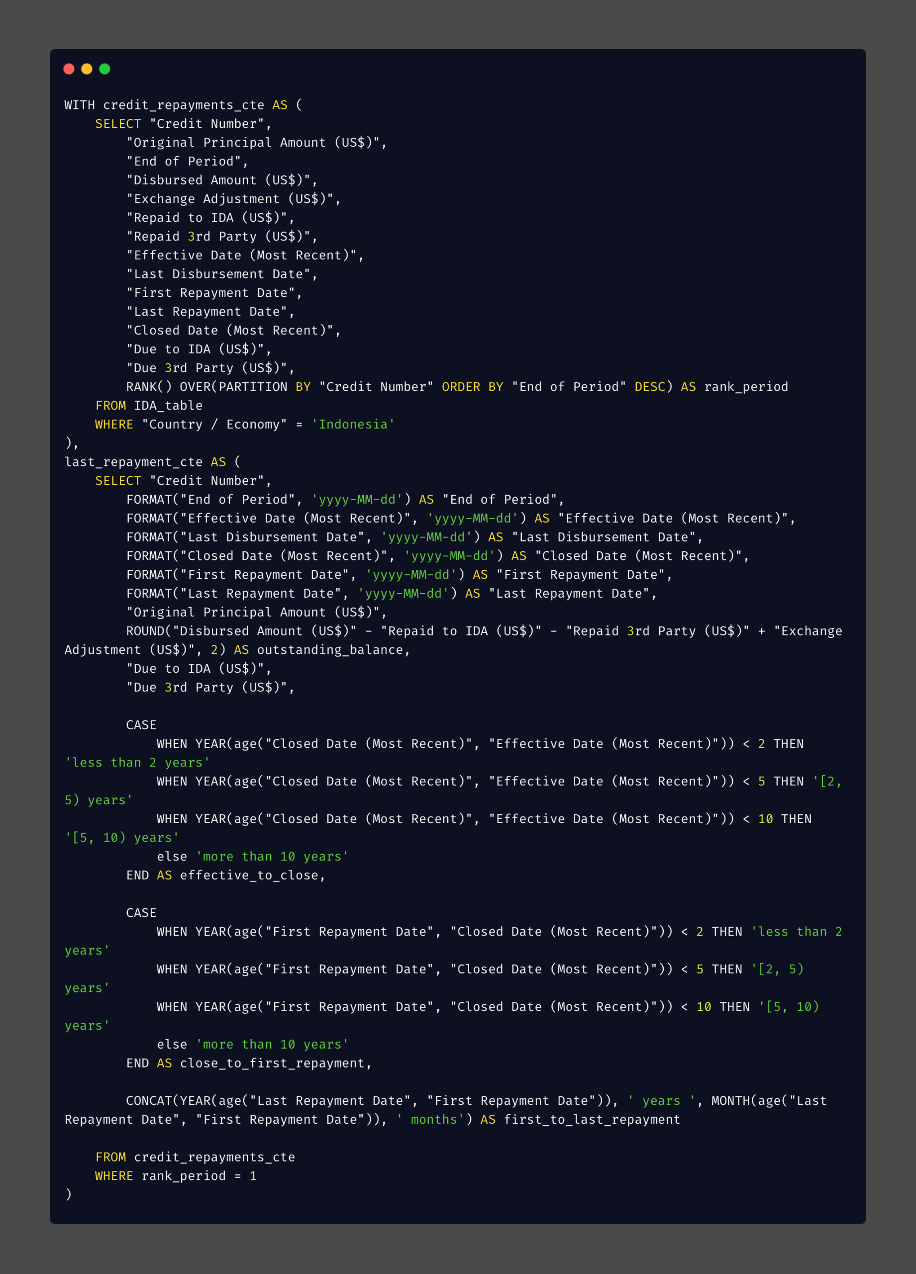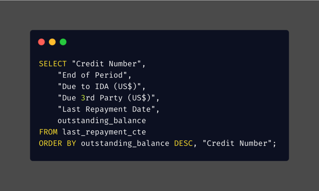In this section, the analysis is based on two CTEs detailed below. These CTEs include all the necessary parameters for analysis, and the data analysis is based on the credit numbers. I have captured the most recent data for each credit number, focusing on the latest end period.