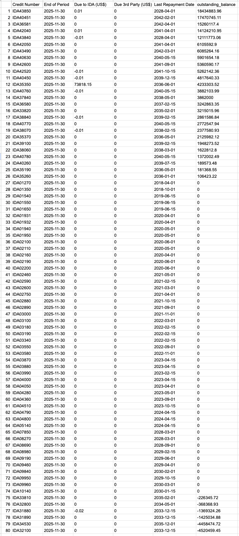 - All credit numbers start with ‘IDA’ followed by a number, indicating that all the funding is provided in the form of credits rather than grants or guaranteed funds. This means the money given must be repaid.