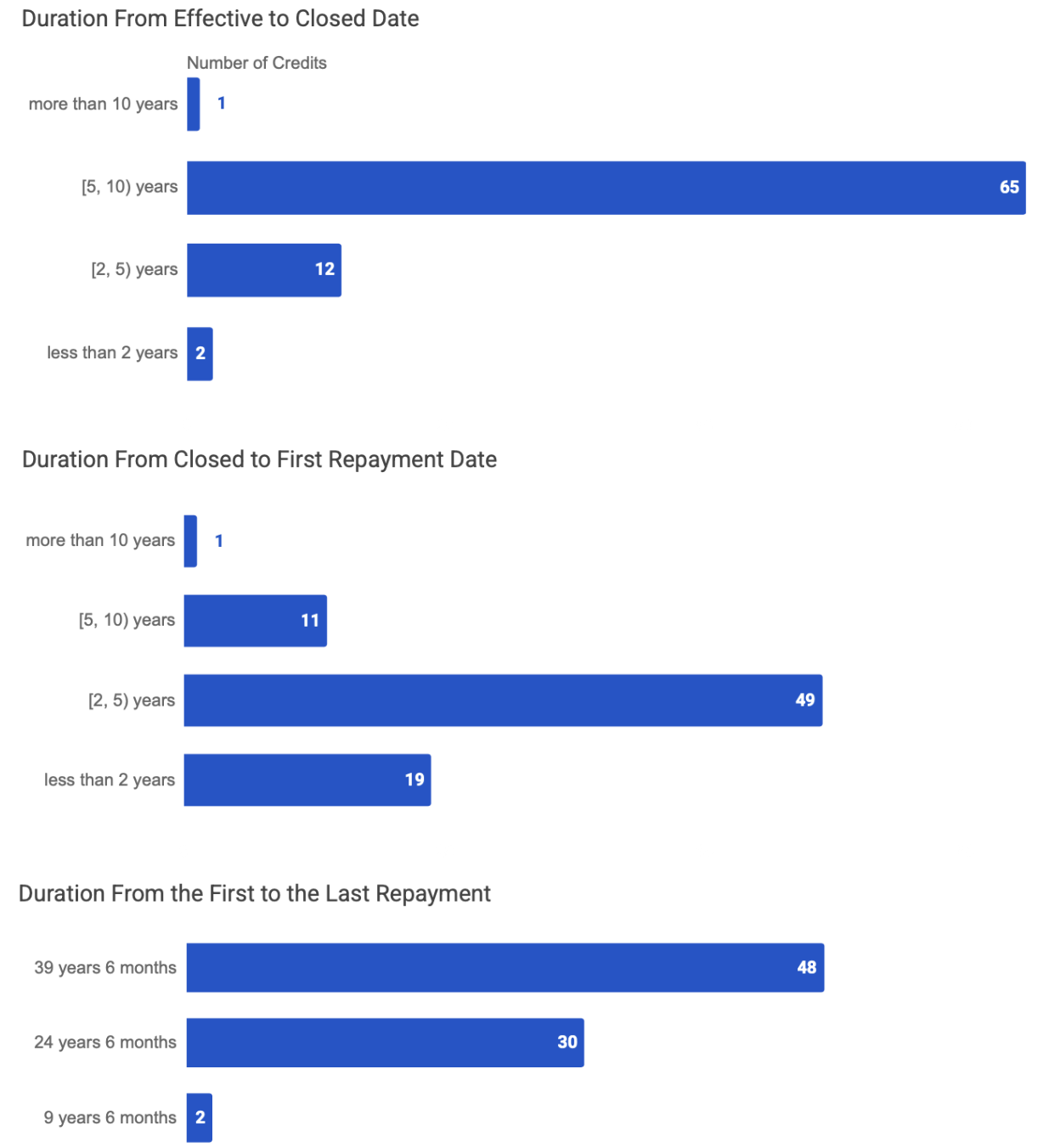 - Based on the duration between the effective and closed dates, 81% of the credit numbers approved for Indonesia had a duration of 5 to 10 years. And, 60% of the credit numbers are expected to be repaid within a total period of 39 years and 6 months, from the first repayment to the last, which is the longest repayment duration observed.