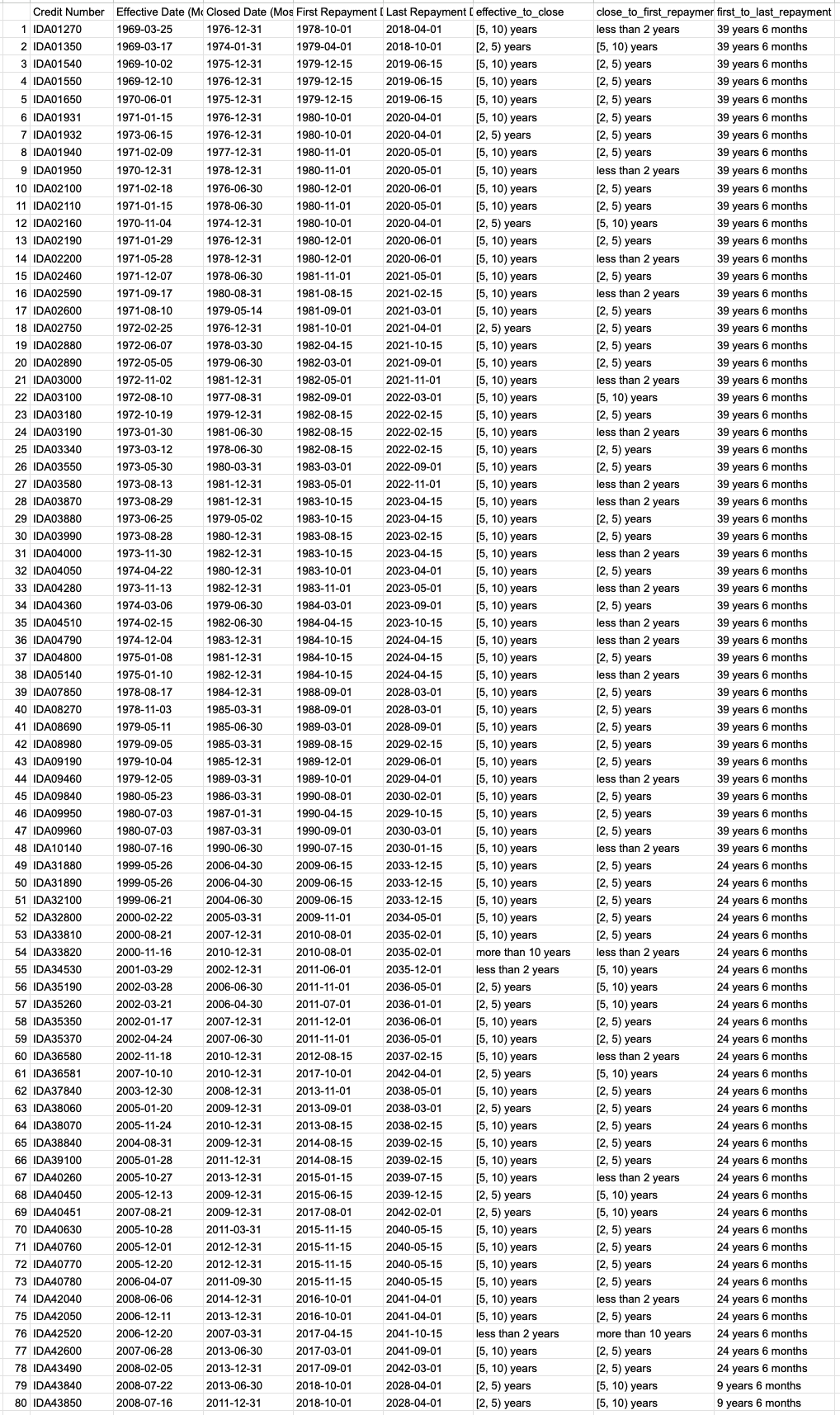 Note that, the IDA Statement of Credits, Grants, and Guarantees dataset takes a “snapshot” approach to track the history of each loan over time. This means that instead of listing each loan just once, it shows multiple updates about the loan from the time it is approved until it is fully paid off or closed. As a result, a single loan appears in multiple rows.